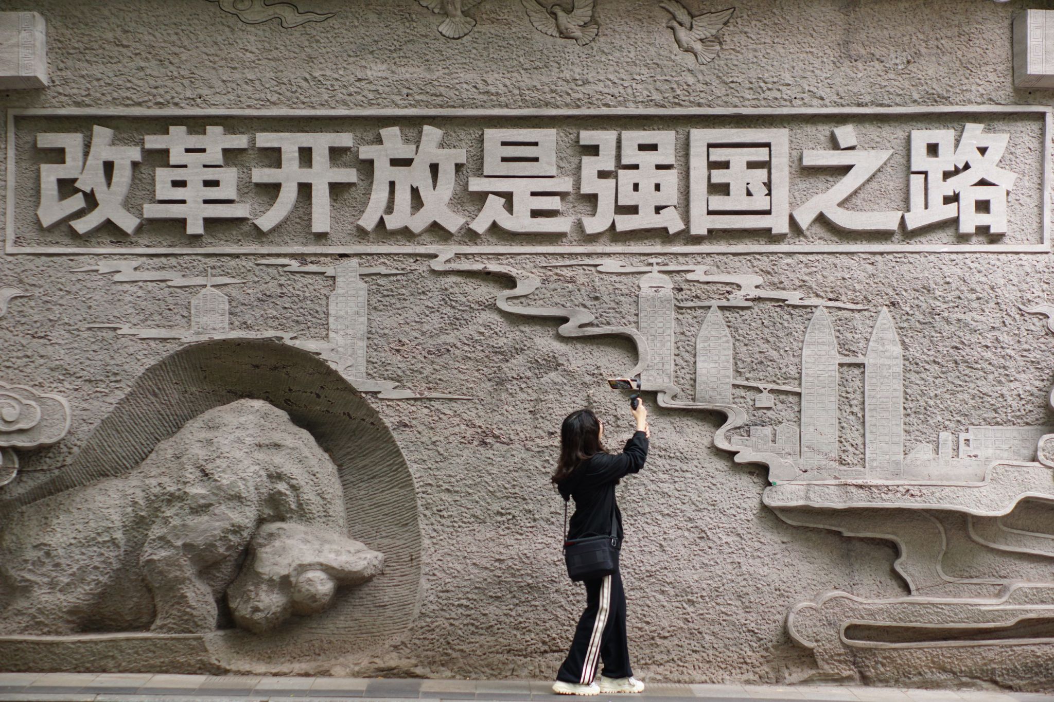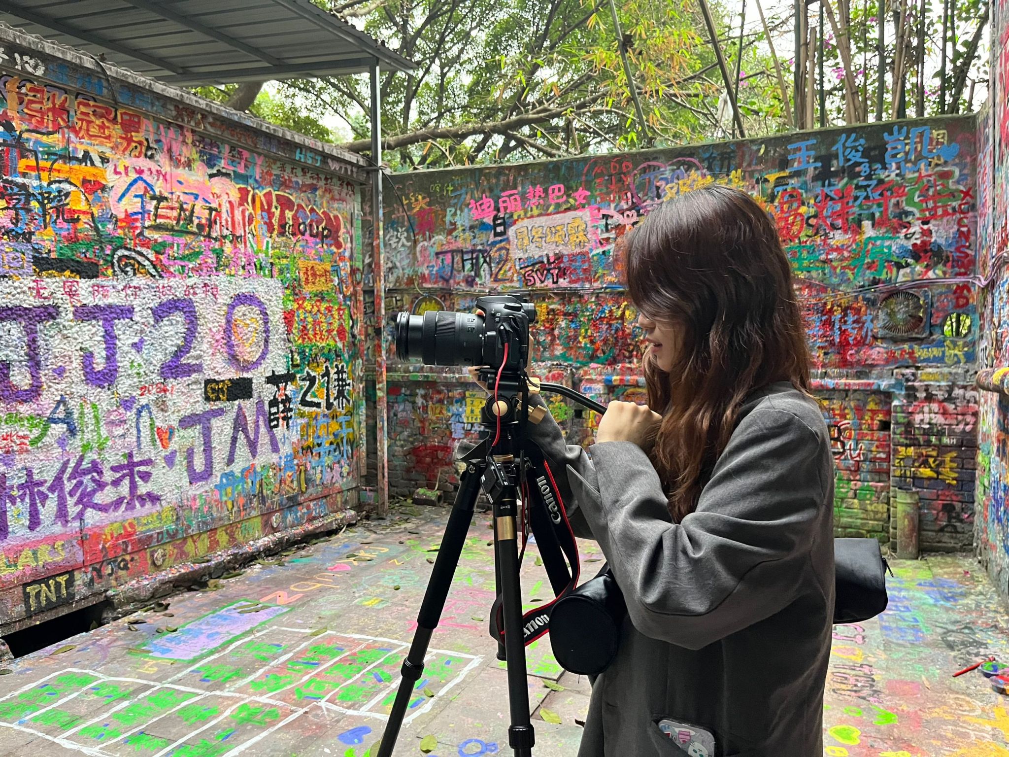 同学在对涂鸦墙进行拍摄