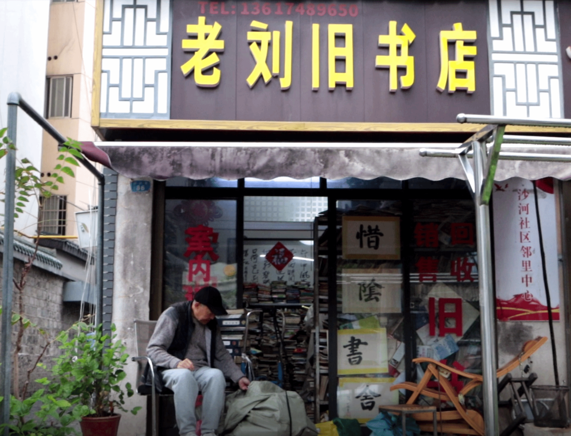 老刘旧书店坐落在一条深深的巷子里的一个偏僻街角上。从外面看,非常小,门口还挂着一块幕布。若不是门楣上的几个大字“老刘旧书店”,很难想象在这样一个小巷子里有这么一个充满书香味道的地方。店主叫做刘德明,从1988年开店至今已经在这坚守了36年。