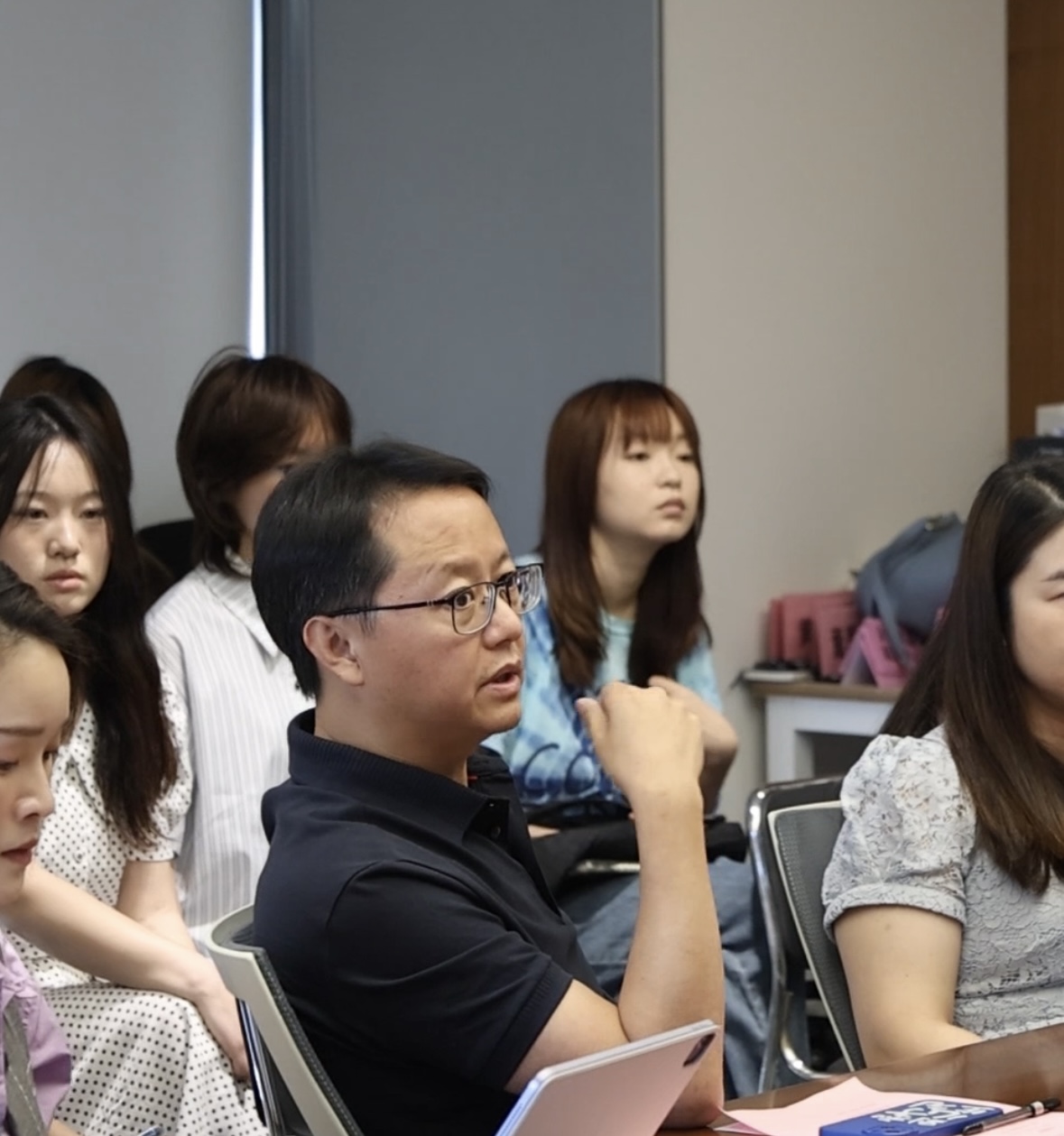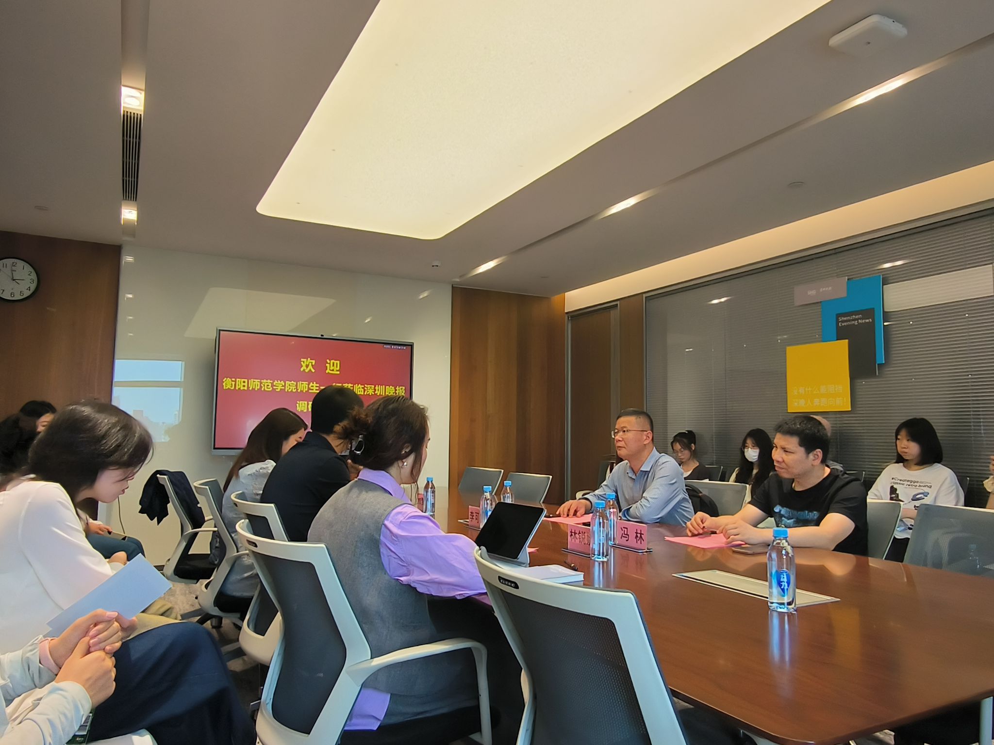 参观展厅随后,来到17楼会议室,一场干货满满的座谈会拉开帷幕。深圳晚报党委委员李可心率先致欢迎词,热情欢迎远道而来的师生。接着,创意策划中心主任张梦莹分享深圳晚报转型成果,从内容创新到运营模式转变,一系列亮眼成绩彰显了媒体转型的决心与成效。视频直播中心副主任林锐娜则聚焦深圳晚报出品的视频,用精彩案例讲述如何打造爆款视频,赢得阵阵掌声。