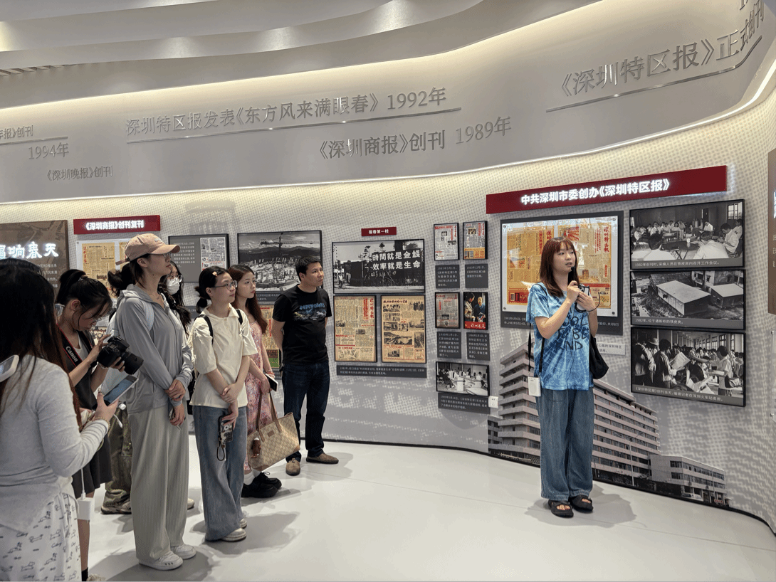 首先,城区新闻中心易芬副主任带领师生们移步至报业集团展厅。几十分钟的参观,伴随着讲解,仿佛穿越了深圳报业的发展长廊。从一张张泛黄的报纸见证城市变迁,到多媒体展示区的科技感十足,深圳报业在时代浪潮中的奋进历程徐徐展开,让师生们深刻体会到传媒行业的变革力量。