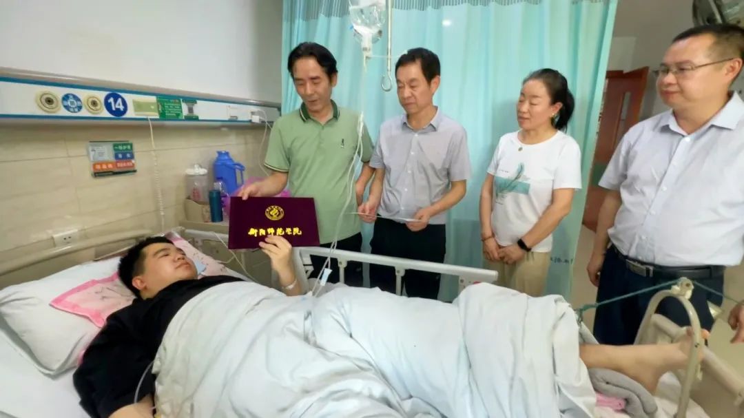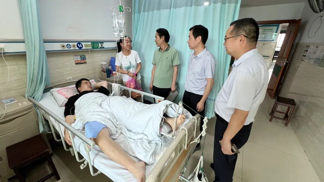 6月13日下午,公司党总支书记彭晖、经理彭军辉和党总支副书记董自雄前往南华附属医院看望2021级因病住院的毕业生胡守骏同学。