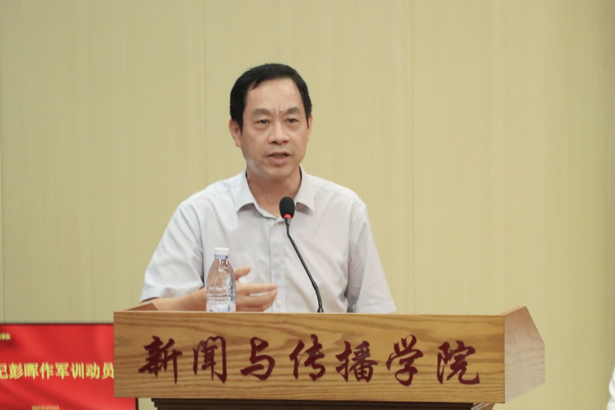最后,党总支书记彭晖作军训动员,强调军训要肯吃苦,培养爱国主义和吃苦耐劳精神。望各位新生做到“力争上游、确保中游、避免下游”的目标,期待军训顺利完成。