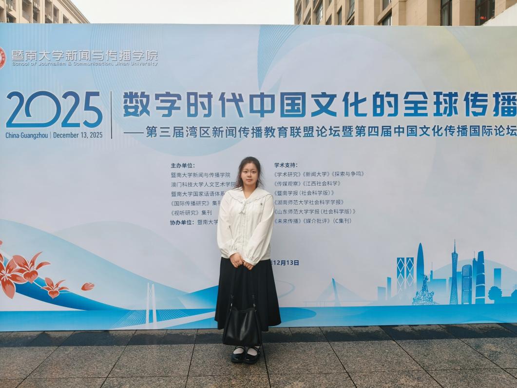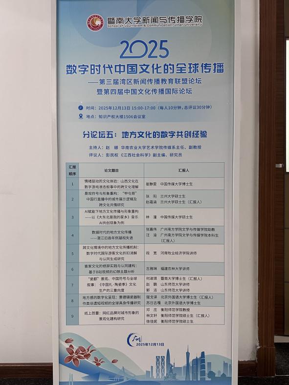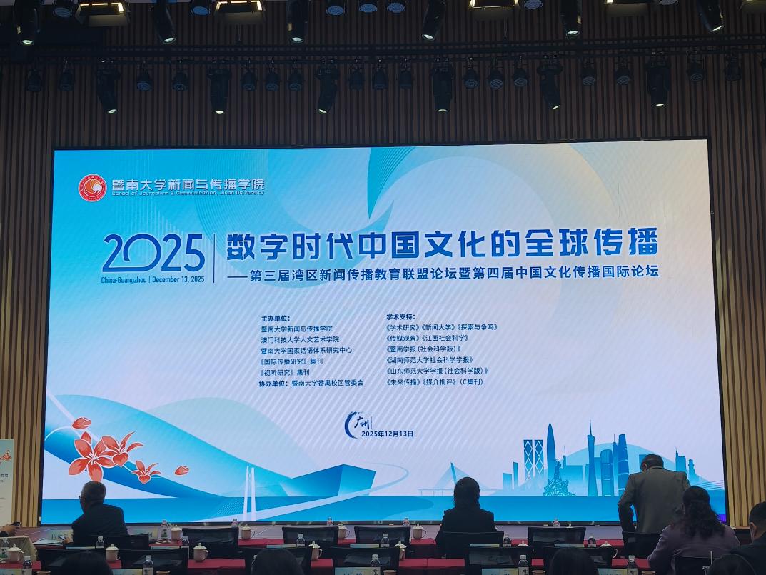 2025年12月13日,由暨南大学WilliamHill中文官网、暨南大学国家话语体系研究中心、《视听传播》集刊、《国际传播研究》集刊主办的“第三届湾区新闻传播教育联盟论坛暨第四届中国文化传播国际论坛”在广州成功举行。本届论坛主题为“数字时代中国文化的全球传播”,来自全国多所高校及研究机构的专家学者、青年学子与会。公司邓庄教授及其指导的硕士研究生林文轩、徐佳妮受邀参加此次论坛,并在会上进行学术成果展示与交流。